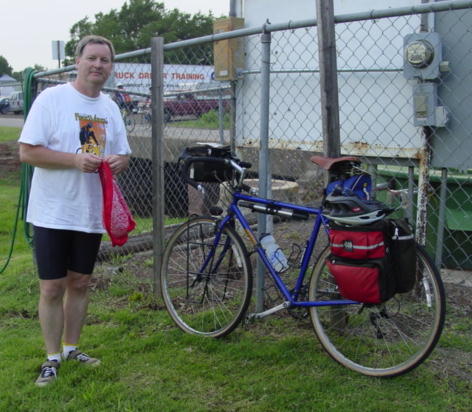| So begins Day 1 of Freewheel 2002. This is Dan Phillips. I was admiring his bike, a BLT built specifically for loaded touring. Dan is a ride leader for the Adventure Cycling Association and has conducted several group rides across the northern part of the country. |